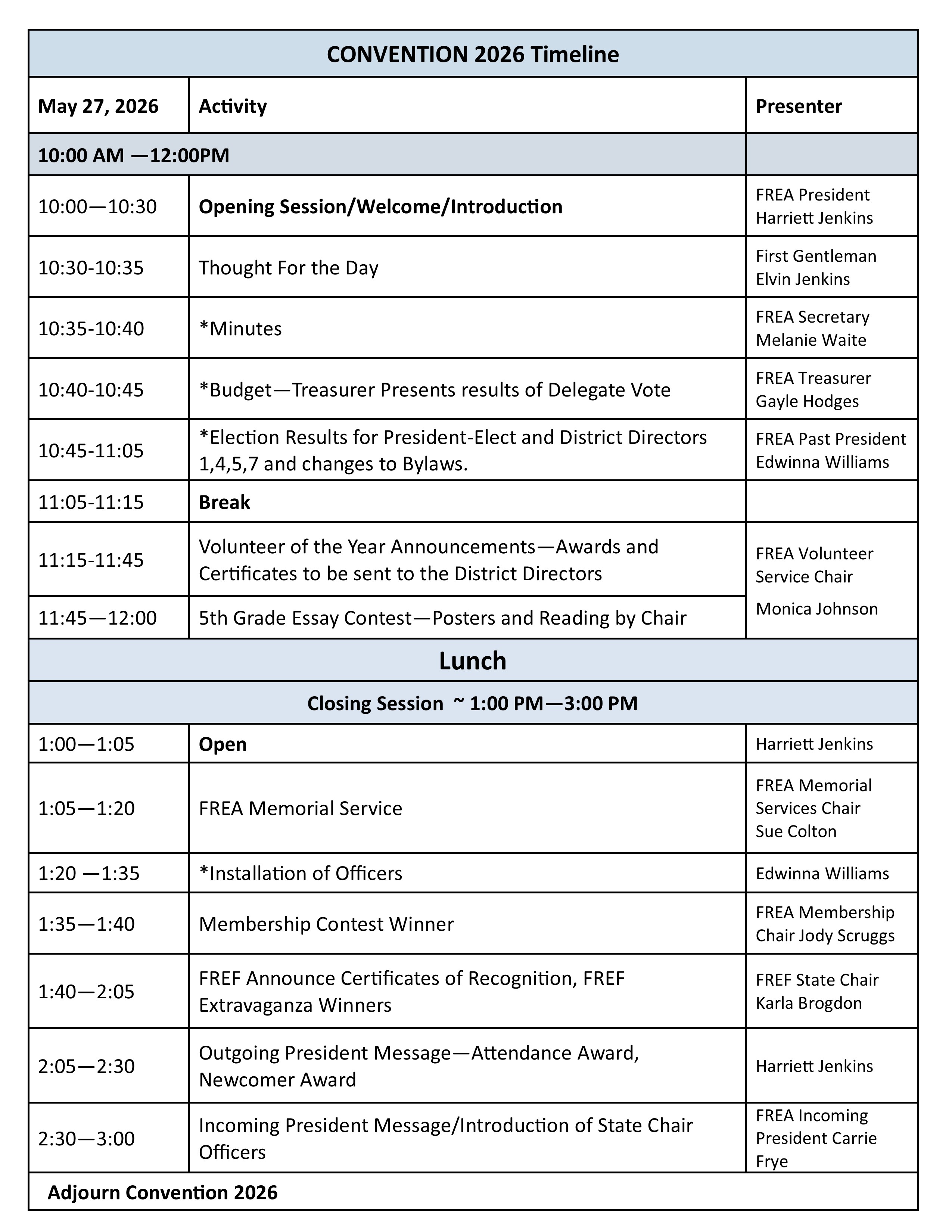 Other information on Delegates and additional logistics are still being worked on to ensure that the 2026 Delegate Convention adheres to the FREA Bylaws and all other requirements.